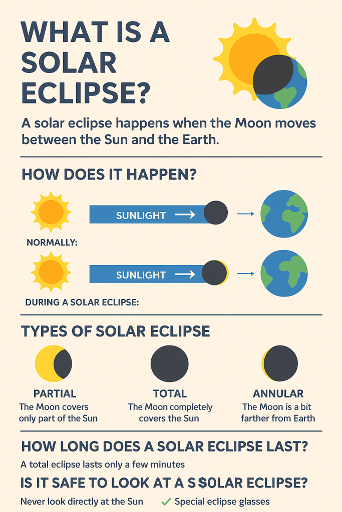 A solar eclipse happens when the Moon moves between the Sun and the Earth.