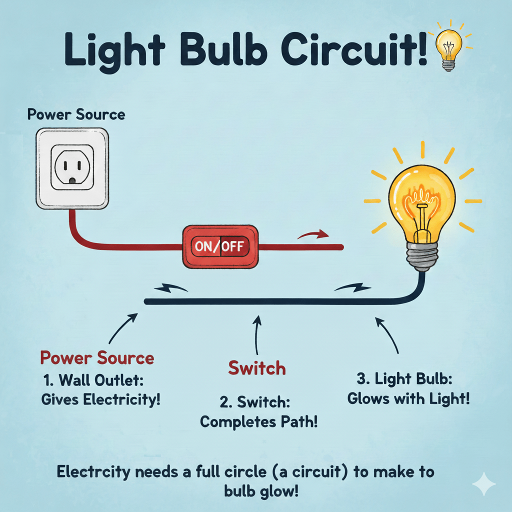 A light bulb takes electricity and turns it into light and heat. It’s like a tiny, controlled lightning bolt inside a glass bubble!