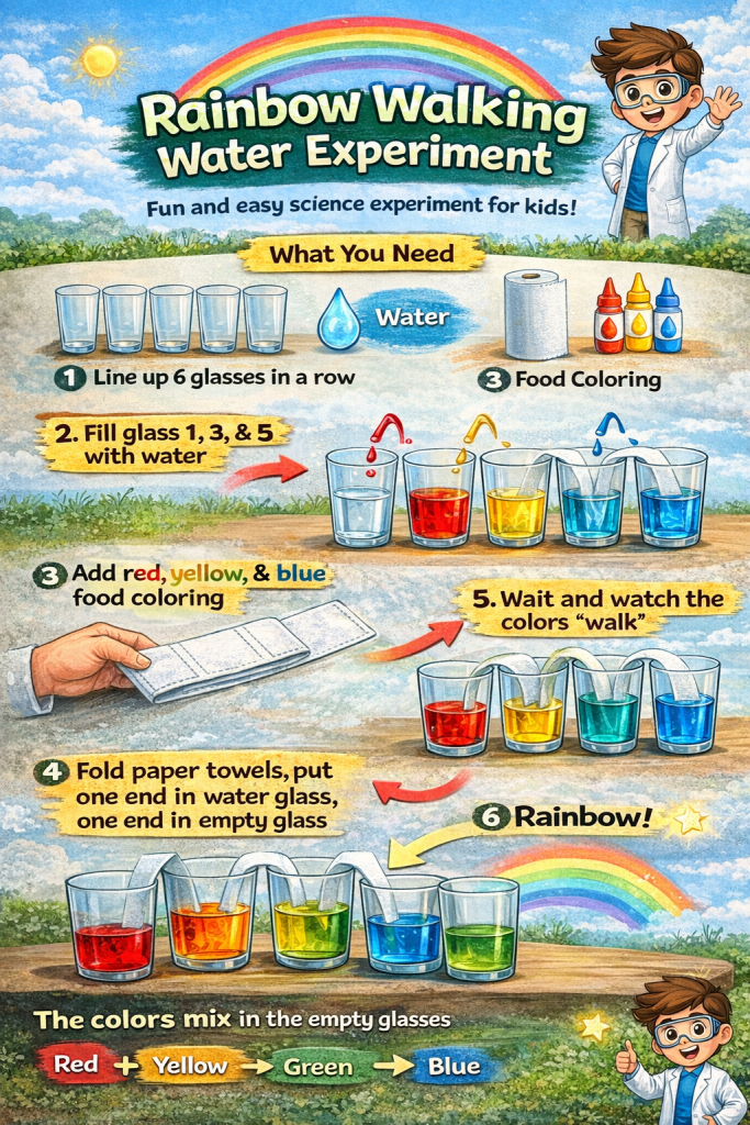 The rainbow walking water experiment shows how water moves through paper towels using capillary action and mixes colors.