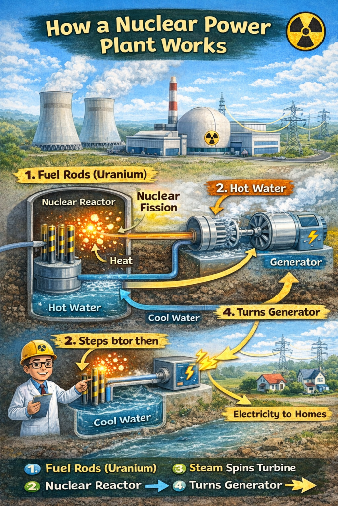 Nuclear power makes electricity from splitting atoms, gives clean energy, but needs careful safety because of radiation and waste.